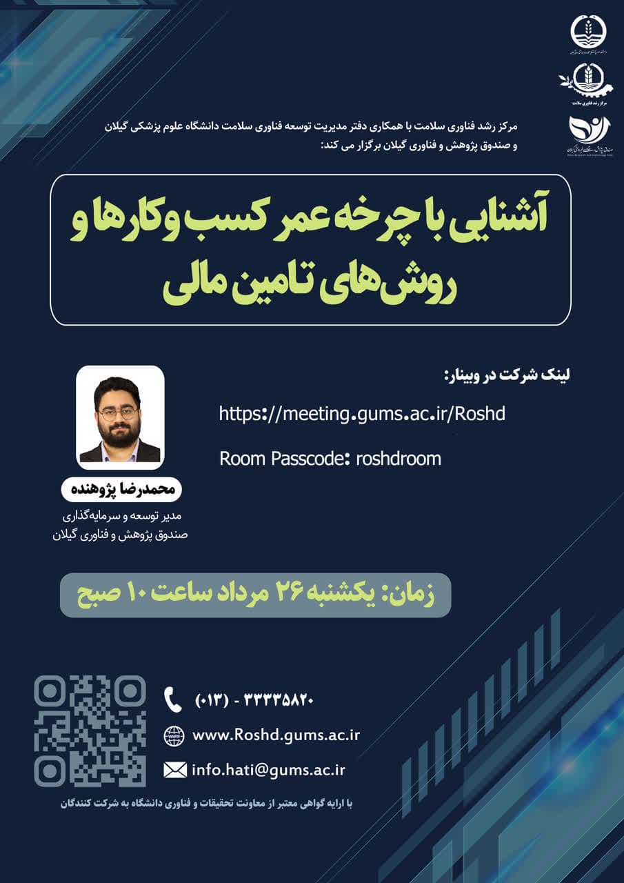 مرکز رشد فناوری سلامت با همکاری دفتر توسعه سلامت معاونت تحقیقات و فناوری دانشگاه در نظر دارد کارگاه آموزشی با عنوان "آشنایی با چرخه عمر کسب و کارها و روش های تامین مالی " ویژه اعضای محترم هیات علمی، کارشناسان و فناوران در تاریخ 1404/5/26 ساعت 10 با ارائه جناب آقای مهندس محمدرضا پژوهنده-مدیر توسعه و سرمایه گذاری صندوق پژوهش و فناوری گیلان، برگزار نماید.